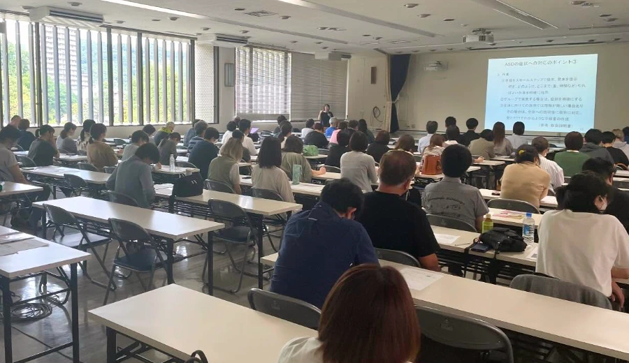 愛媛県公立学校共済組合愛媛支部との共同事業です。愛媛県公立学校共済愛媛支部は、道後温泉にある「にぎたつ会館」を運営しており、ここで、全国の公立学校教員のために様々なメンタルヘルス支援プログラムを計画し、運営しております。本学は、この計画や運営のお手伝いをしています。