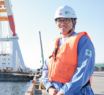 具体的な仕事内容は、申請書や計画書作成といったデスクワークに加え、現場代理人の補佐として現場での監督にも取り組んでいます。現場の数を踏んでいくことで、作成書類の精度も上がり、自分自身の成長や達成感にもつながっています。大学で学んだ環境保全の知識は、港での荷役作業や海上での施工時に海洋環境への影響、海洋汚染防止対策を考える必要がありますので非常に役立っています。