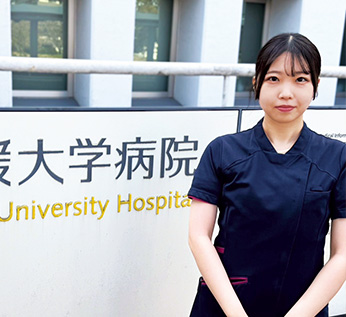 両親が医療介護系の職業に就いていたため、もともと医療系の職業に関心がありましたが、高校入学時に医療系のコースがあり、病院見学や体験を通して看護師に改めて興味を持ちました。大府キャンパスのオープンキャンパスに行った際に、松山看護学部の事務の方に会い、松山看護学部のオープンキャンパスにも参加することにしました。教職員の方々が優しく、ここで学びたいと気持ちが固まりました。また県外に出て、今までとは違う環境で、さまざまな経験をしてみたいという想いもあり、地元を飛び出したおかげで、文字通り人としても成長できたと思います。現在は主科の疾患がなく、身体的な疾患から精神疾患まで多様な患者さんを受け持っています。緊急入院の対応や術後の患者さんの観察、主科の病棟への転棟や申し送り、また日常生活援助や検査出棟など、業務は多岐に渡り多忙ですが、学びが多く充実しています。