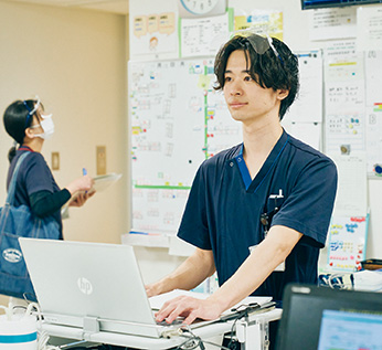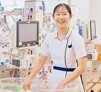 現在は消化器内科に所属しています。患者さんの清潔ケアなど日常生活援助、内視鏡検査を受ける方の検査前後の観察、緊急入院、転入された方への対応などさまざまな業務に携わっています。業務内容は多岐に渡るため、常に多忙ではありますが、毎日新たな学びがあります。できる事が一つひとつ増えていき、一人の看護師として日を追うごとに成長できていることを実感しています。