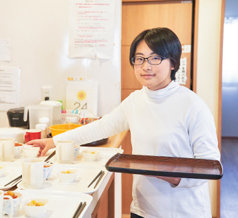 中学生のころ、祖父の車いすを押したのがきっかけで、介護という仕事が自分にはあっているのではないかと思いました。現在、私は「グループホーム」という認知症に特化した施設で働いており、ご利用者様の生活のサポートをしています。介護というのは、ご利用者様と対話しながら支えていく仕事です。うまく対話ができないこともありますが、ご利用者様に合わせたコミュニケーションの取り方がわかった時、達成感を感じます。また、私が行動したことでご利用者様が笑顔になったり、「ありがとう」と言われたりすると、とてもやりがいを感じます。本学部の魅力は、職業の選択肢をカウンセラーに絞らず、多くのことを学べるところです。常に役立っているのは、コミュニケーション方法です。これは授業・座学もそうですが、先生や就職・進路相談室の方々と関わったことで身につけることができました。まだまだ半人前ではありますが、ご利用者様に合わせた会話の仕方やご利用者様に合わせた支援、介助はできるようになってきたと実感しています。