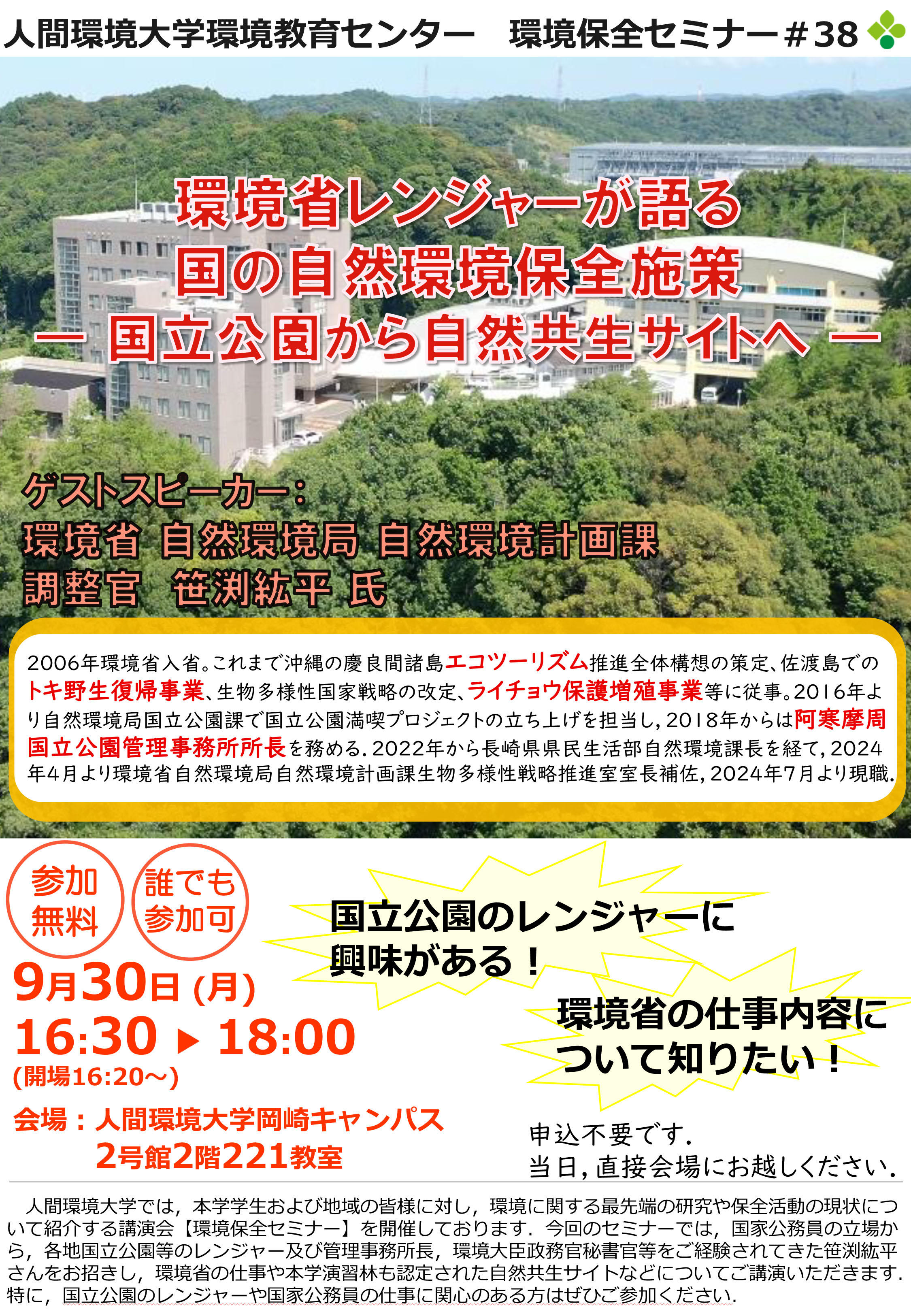 人間環境大学では、本学学生および地域の皆様に対し、環境に関する最先端の研究や保全活動の現状について紹介する講演会【環境保全セミナー】を開催しております。今回のセミナーでは、大学演習林が「自然共生サイト」に認定されたことを記念して、「自然共生サイト」の担当部署である環境省自然環境局自然環境計画課の笹渕紘平さんをお招きし、各地国立公園等のレンジャー及び管理事務所長、環境大臣政務官秘書官等のご経験などの環境省における仕事や、「自然共生サイト」などについてご講演いただきます。