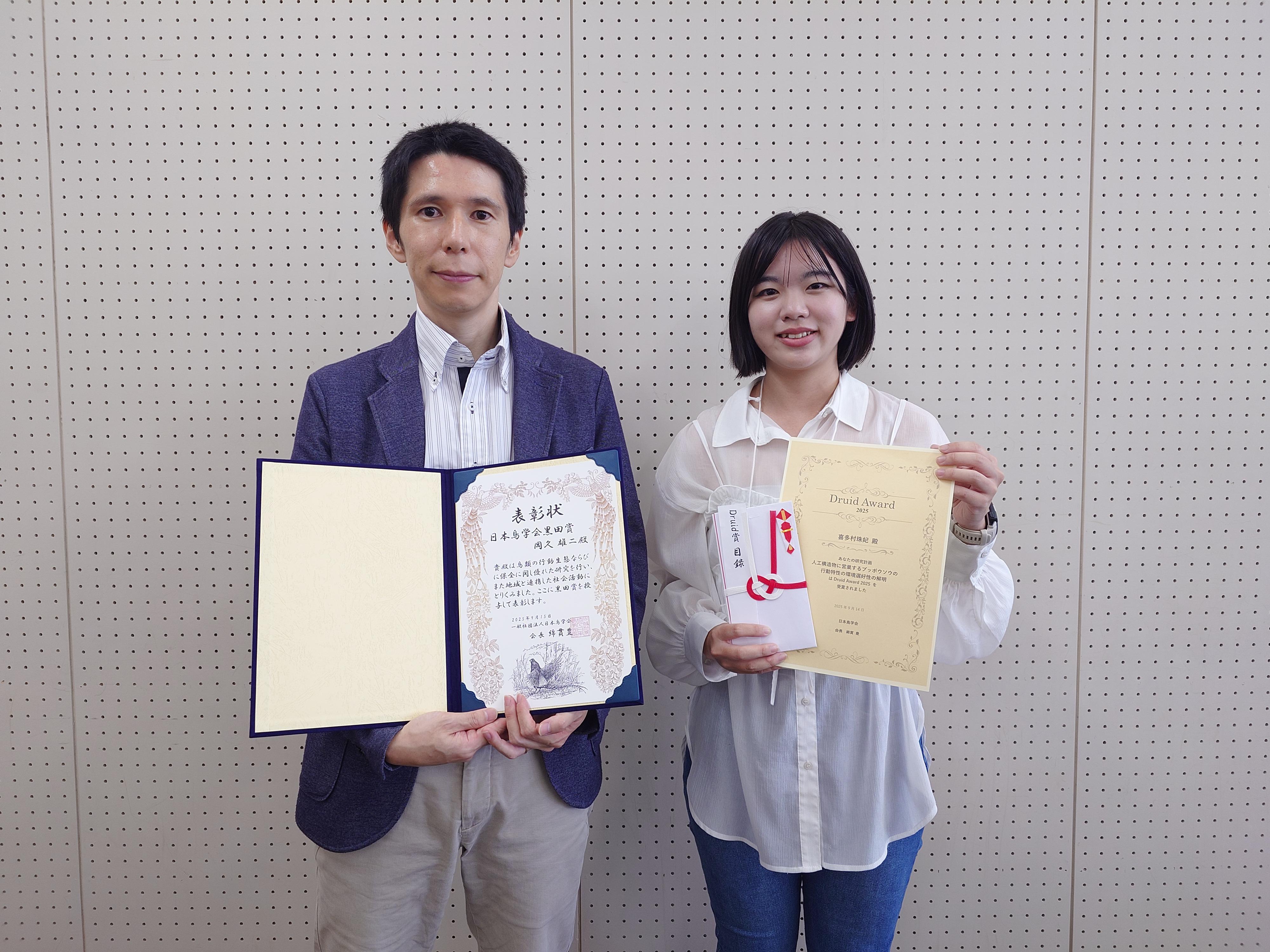 【環境科学部】 日本鳥類学会2025年度大会において、岡久雄二講師が「黒田賞」、喜多村珠妃さんが「Druid賞」を受賞しました