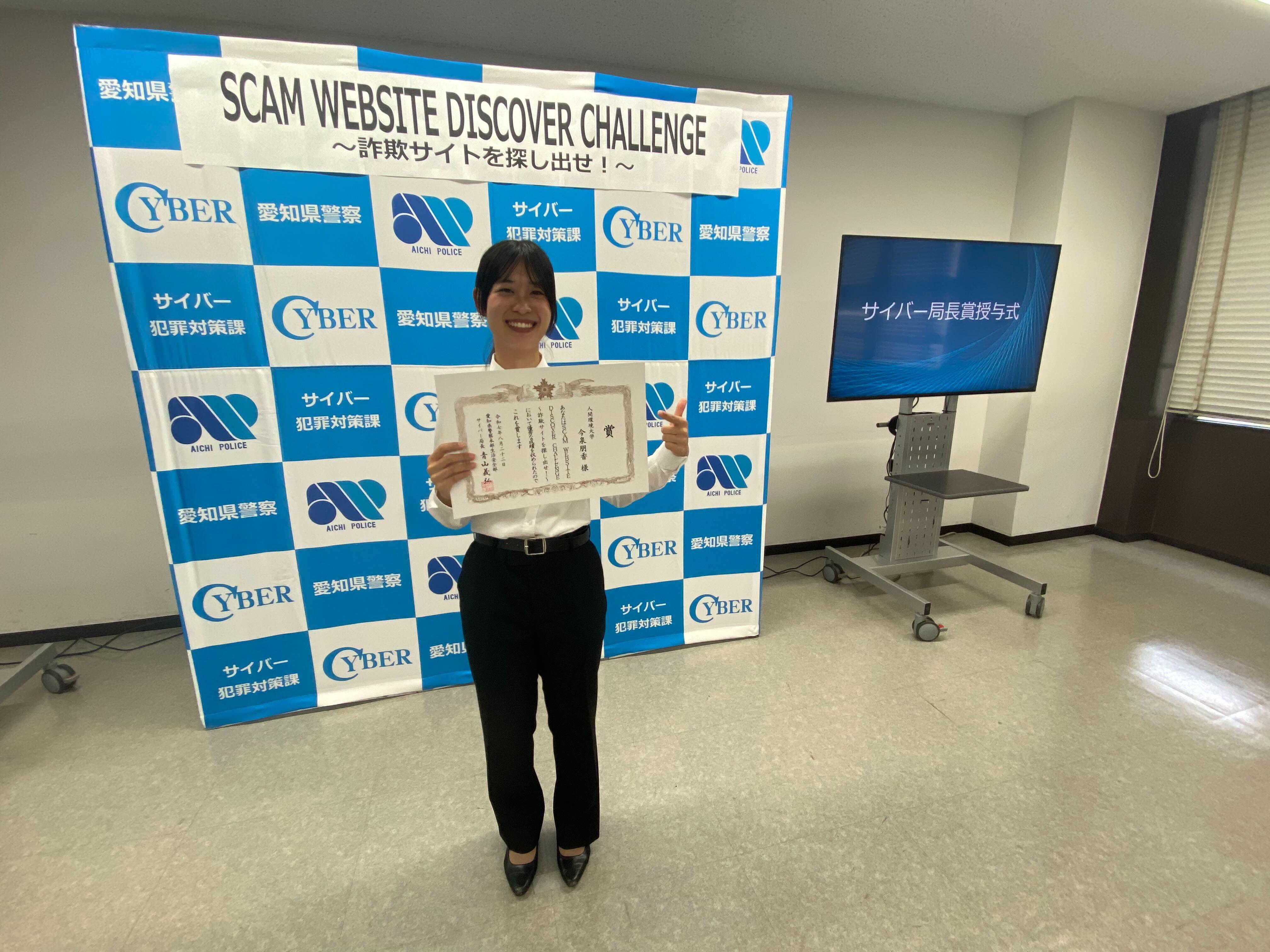 8月22日に愛知県警察本部で「SCAM WEBSITE DISCOVER CHALLENGE~詐欺サイトを探し出せ!~」の表彰式が行われ,人間環境大学心理学部犯罪心理学科3年今泉朋香さんがサイバー局長賞を受賞しました。
