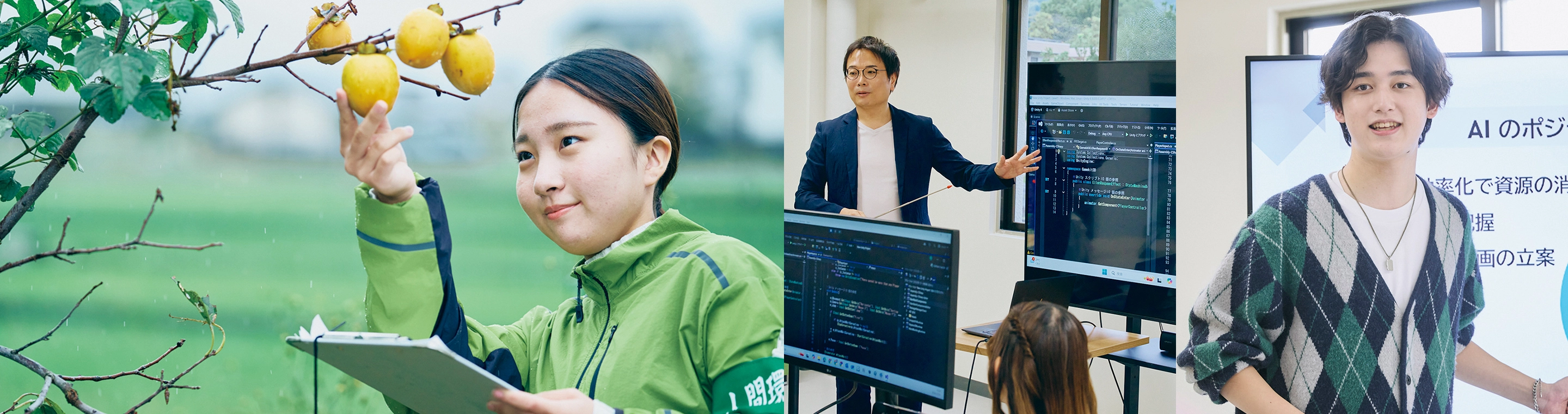 私たちは自然環境と社会環境のなかで生活をしてきています。しかし、近年、この自然環境でも、社会環境でもさまざまな問題が起きてきています。その結果、これまでのような生活を今後も持続的に続けていくことができるかどうかが懸念されています。本学部では、このような問題に積極的に取り組み、その有効な解決策を考案・実現していくことを目指します。これらの問題は内容が幅広く、学生のみなさんの興味が湧くようなテーマに焦点を絞ることが可能です。本学部は2025年度新設です。新設だからこそ実現した、最新の学びをみなさんの探求心と結合していきたいと思います。