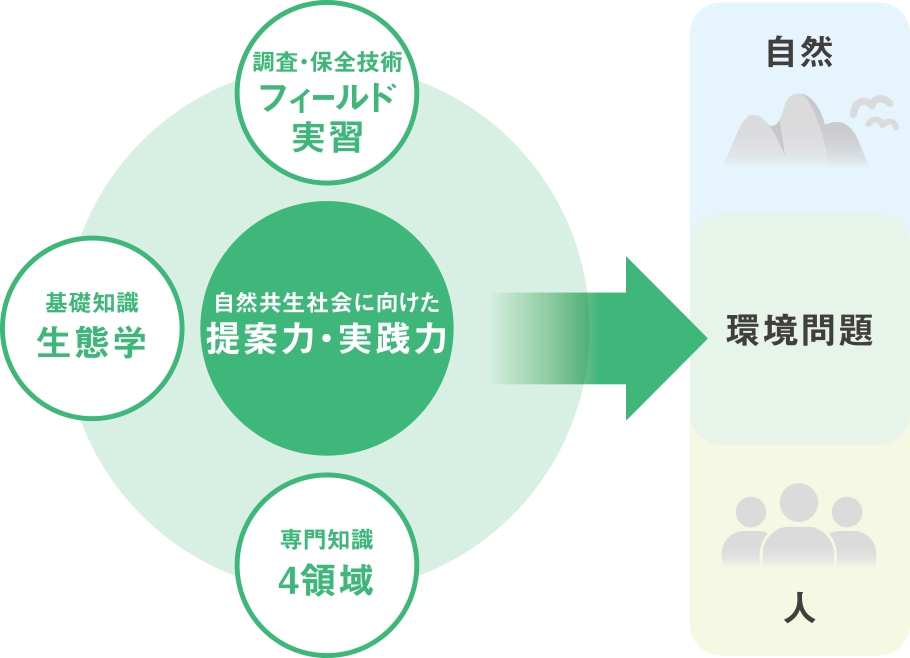 フィールド生態学科では、生物と環境の関係を扱う生態学をカリキュラムの中心科目に据えることで、自然環境を理解する知識を養います。