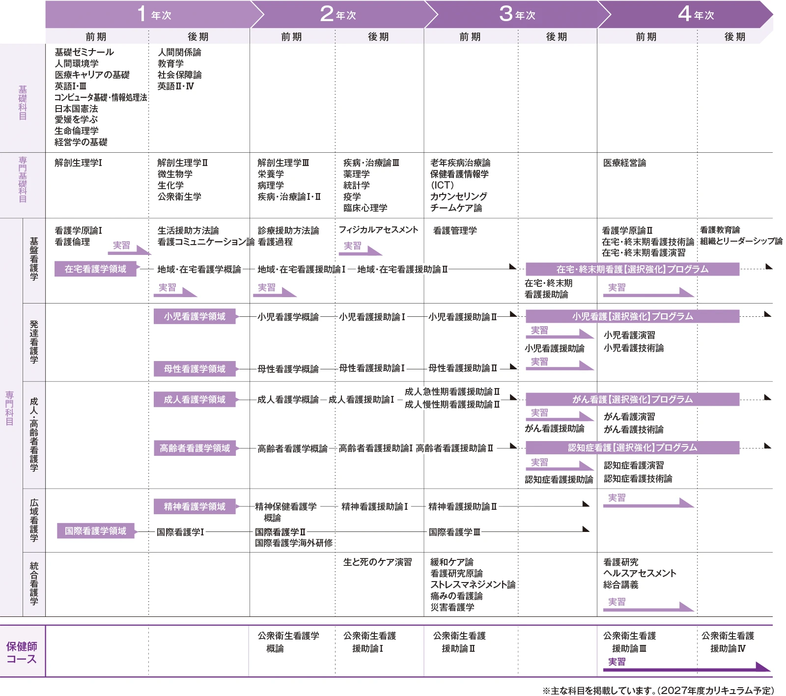 - 3年生後期・4年生:看護研究を通し、「生きる」「老いる」「病気になる」「死を迎える」ことについて深く学びます。