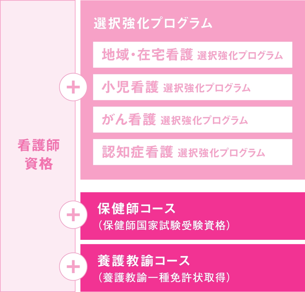 次世代の看護師に求められる専門スキルを身につけるため「選択強化プログラム」を用意するほか、「保健師」「養護教諭一種」の資格取得を目指す専門コースを設置するなど多様なカリキュラムを備えています。