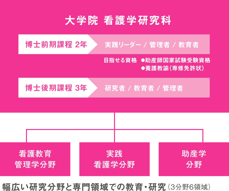 博士前期課程では、看護活動現場の改善と改革を行い良質なサービスによる社会貢献を目指してリーダー・管理者・教育者として活躍できる人材を育成します。博士後期課程では、卓越した研究能力をもって看護活動現場の変革と看護を実践科学として発展させる社会貢献を目指し、創造的で自立した看護研究者と教育者として活躍できる人材を育成します。