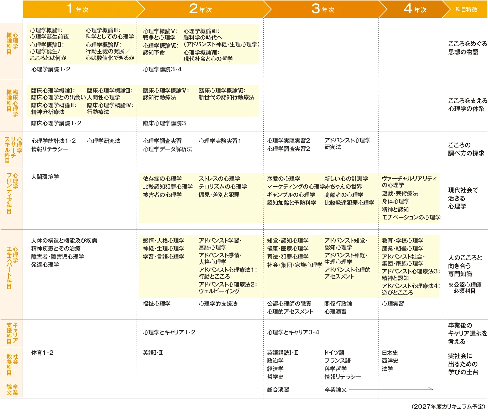 心理学の基本から応用まで、無理なく学べるよう段階的に授業が配置されています。