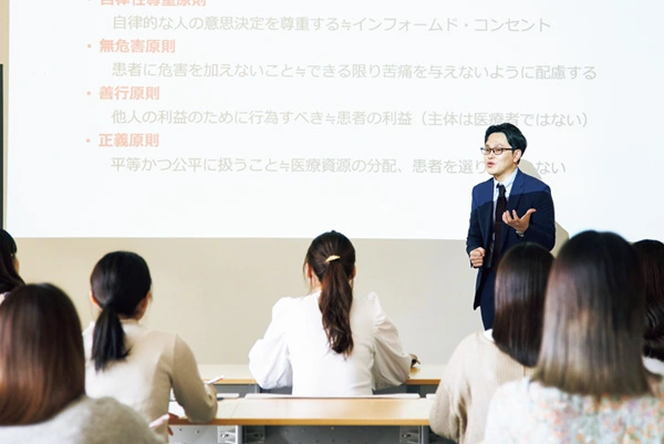 この科目では、各種の精神疾患を引き起こす要因や診断方法のほか、薬物療法から心理社会的支援までを含めた幅広い治療法を学びます。さらに、実際の臨床現場における多職種間や医療機関との連携を想定したチームアプローチについても学びます。