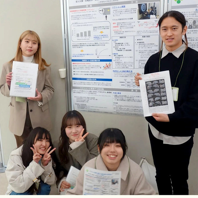 国内の心理学研究の最高峰「日本心理学会」に、1年生から選抜された学生が参加します。引率教員とともに、最新の研究発表を聴講し、質問や議論を重ねて理解を深めます。また本学のブースでは、学生が制作したポスターを用いて発表する機会も。総合心理学部ならではの、まさに“心理学尽くし”の4日間です。
