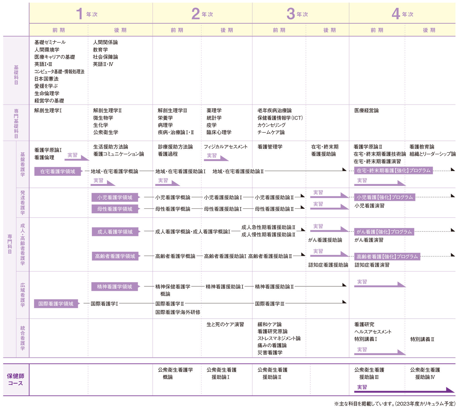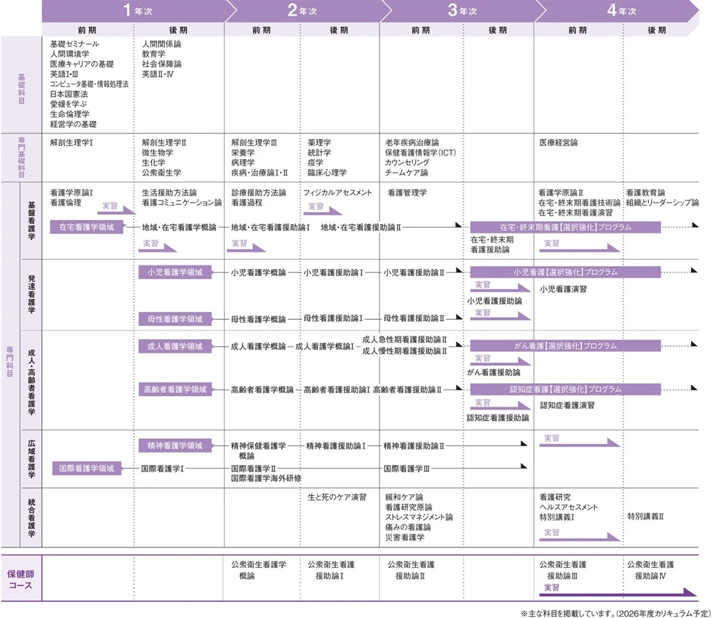 将来、医療人として成長していくための生涯プロセスのあり方を理解し、看護師、保健師、助産師になるための道筋や教育の仕組み、さらに具体的な看護職の活動内容を学び、大学入学後早期より自分自身のキャリア設計を描いていきます。