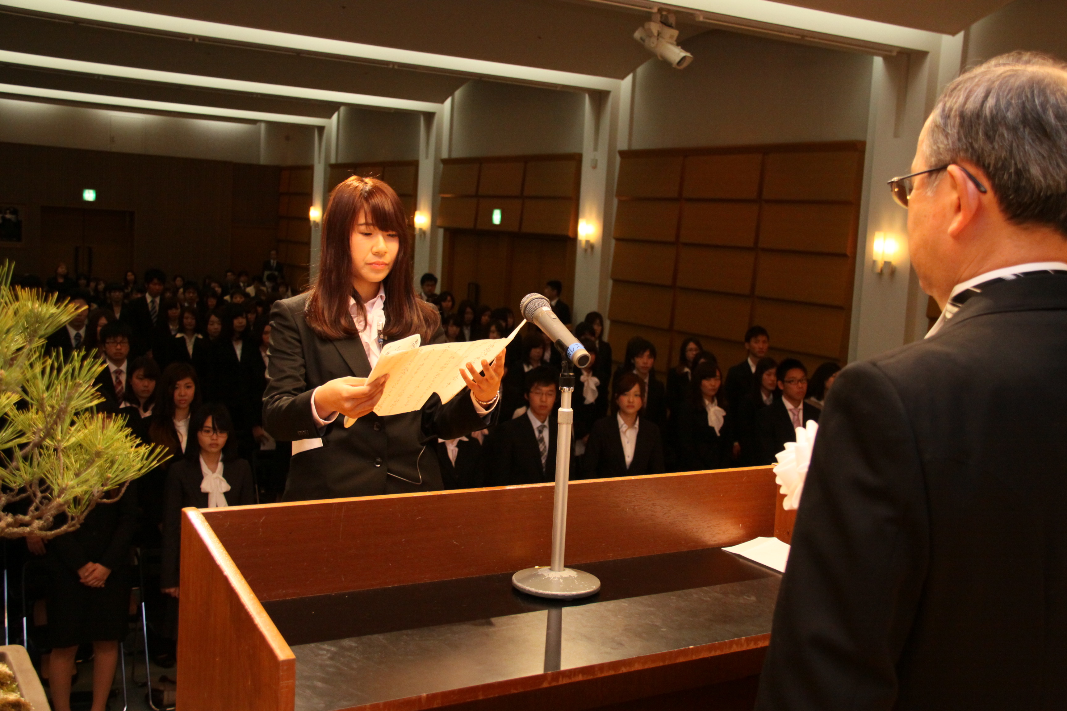 希望に満ち溢れた新入生で一杯の会場のなか、学長式辞(入学許可)、理事長祝辞、来賓紹介、祝電披露、新入生代表 入学のことばと進行しました。