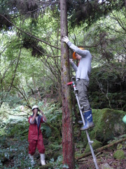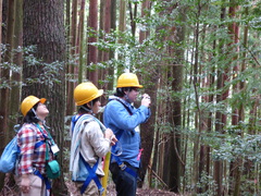 照葉樹調査では、樹種を特定し、胸高直径を測定し、検測桿やバーテックスを使用して樹高を測りました。