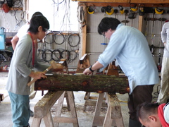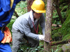 研究林内での実習は、林業作業道具の説明を聞いたり、天然スギ保存林・天然ヒノキ保存林の見学、樹冠観測タワーの見学、照葉樹調査、除伐作業、ナメコの菌打ち作業、皮剥ぎ、木工品制作などを行いました。