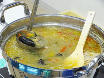 ムール貝、アサリ、イカ、エビ、鱈といった魚介類に加え、パプリカやインゲン豆といった野菜が