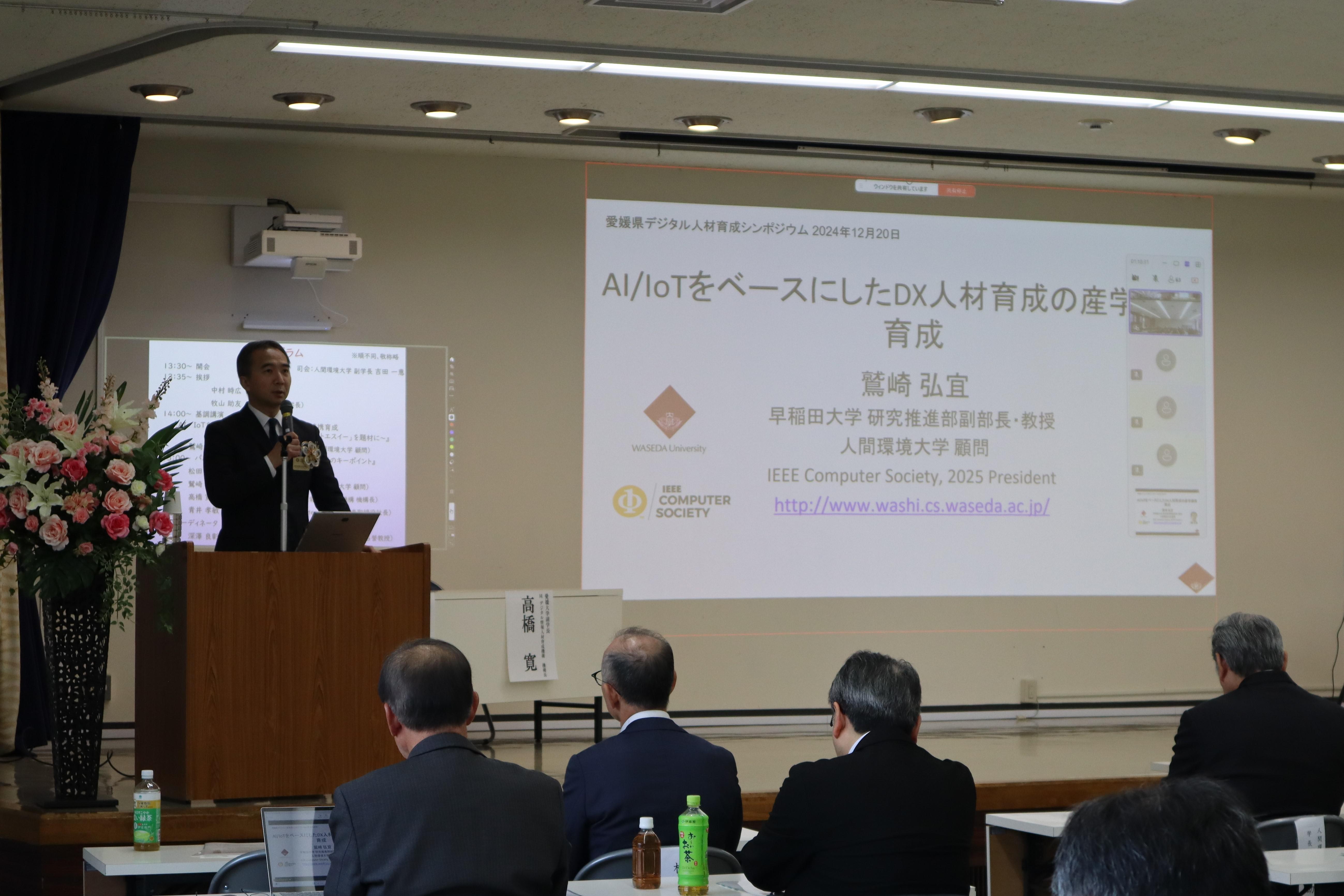 2024年12月20日、人間環境大学松山道後キャンパスにおいて、「愛媛県デジタル人材の育成・確保に向けた連携・協力シンポジウム」が開催されました。オンライン参加者を含めると150名近い参加者があり、熱い議論が展開されました。