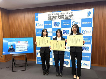 人間環境大学心理学部犯罪心理学科の学生3名が、愛知県警察本部より感謝状を授与されました。これは、インターネット上の違法・有害情報の監視、通報や、サイバー犯罪防止に向けた広報啓発活動など、大学生サイバーボランティアとしての尽力が高く評価されたものです。感謝状贈呈式は令和7年2月27日に執り行われました。