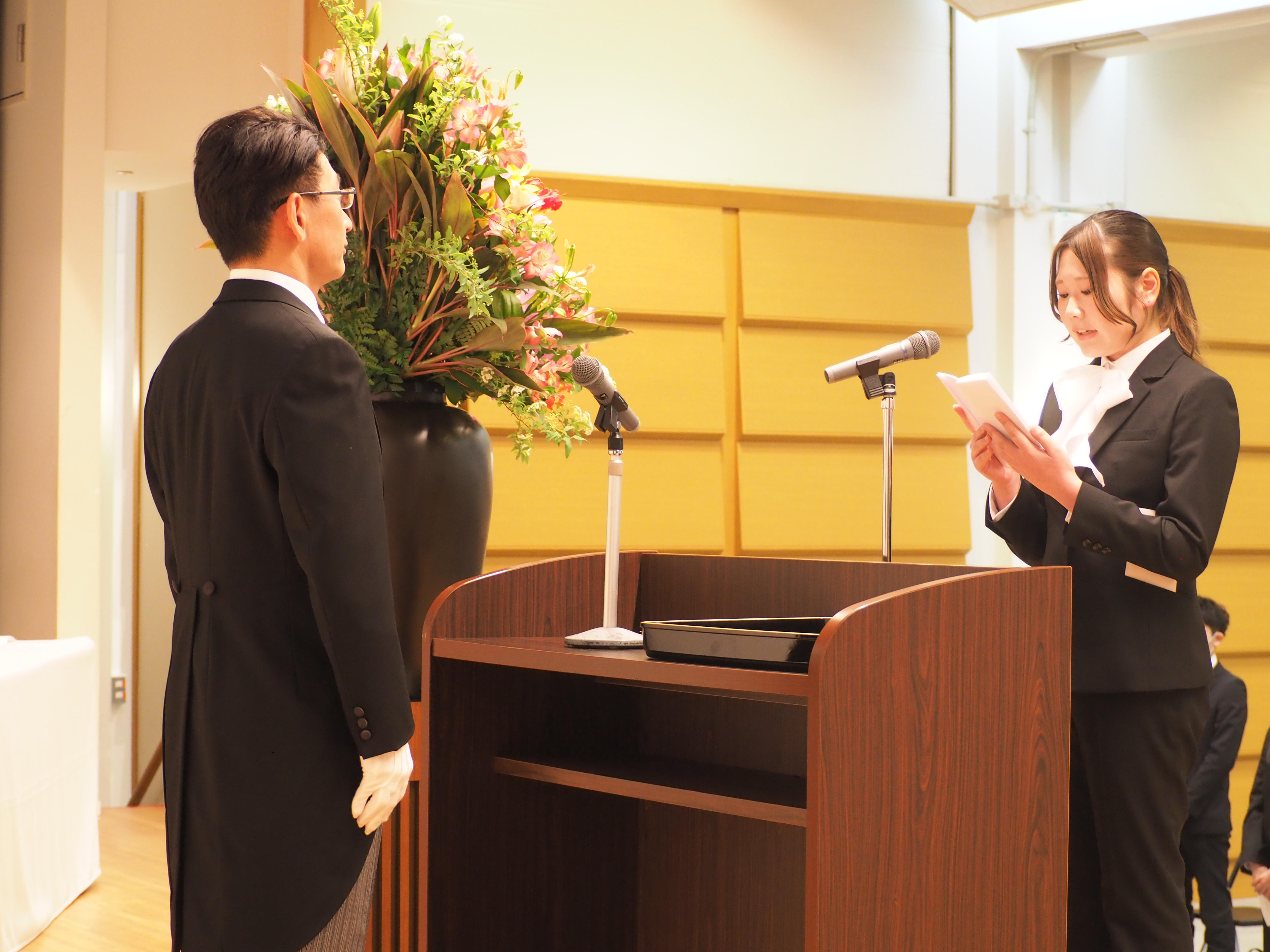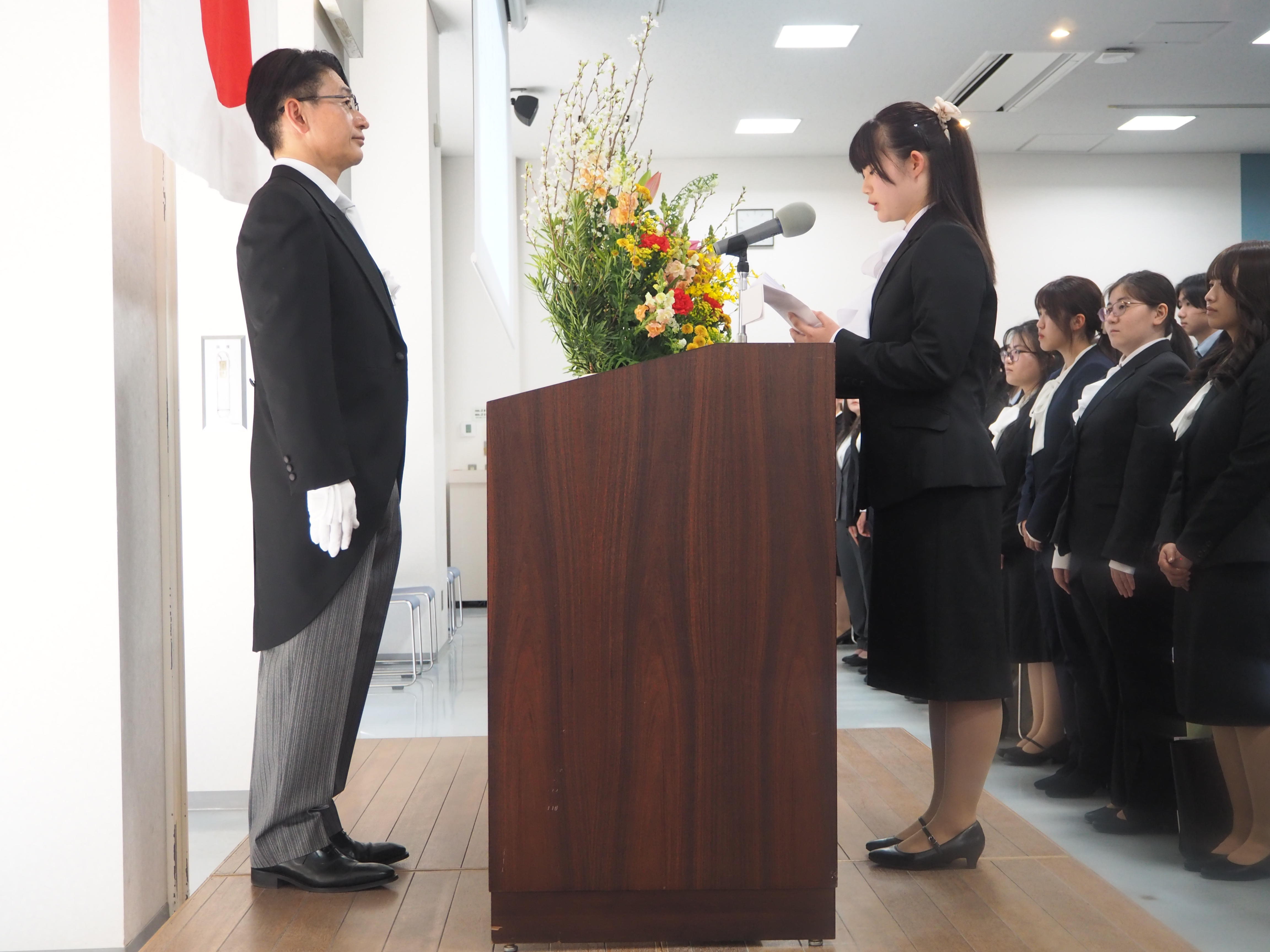 その後、新入生を代表し、松山看護学部看護学科の水田妃優さんが力強く入学生宣誓を行い、大学生活への決意を新たにしました。