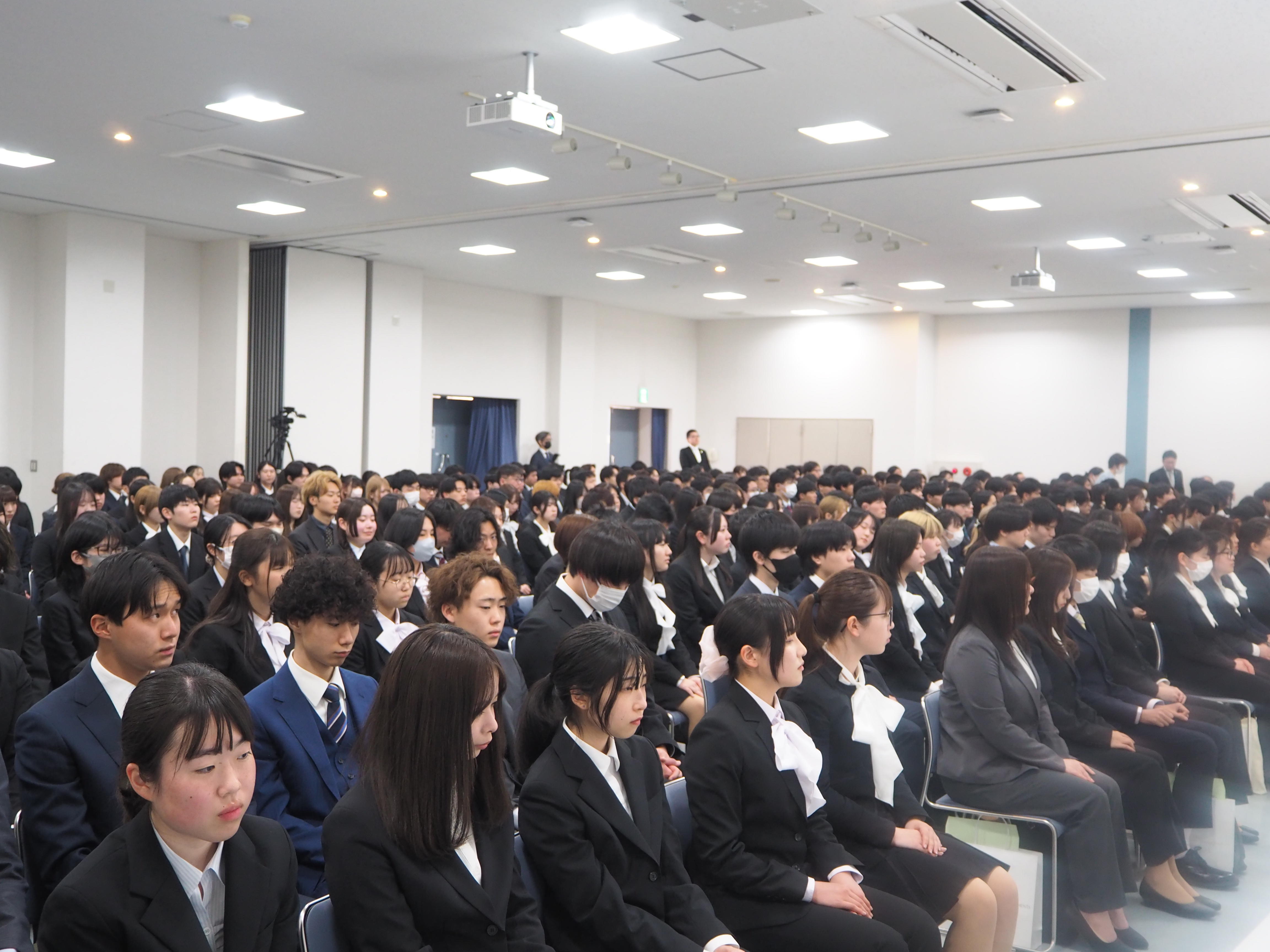 愛媛県県民文化会館にて、松山キャンパスおよび松山道後キャンパスの3学部の入学式を挙行しました。合計336名の新入生を迎え、会場は新たな門出を祝う温かな雰囲気に包まれました。