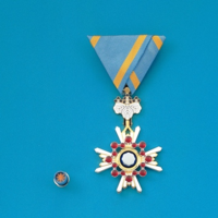 瑞宝章は、明治21年に制定されました。勲章のデザインは、古代の宝であった宝鏡を中心に大小16個の連珠を配して、四条ないし八条の光線を付し、鈕※(章と綬の間にあるもの)には桐の花葉を用いています。