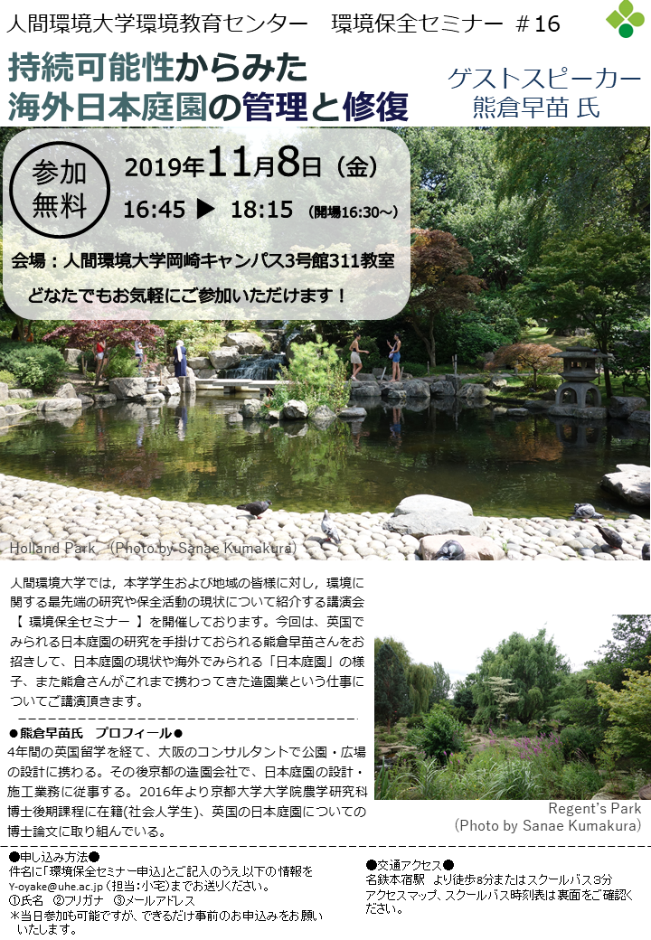 11月8日(金) 16:45より、 人間環境大学岡崎キャンパス 3号館311教室にて、人間環境大学環境教育センター 第16回環境保全セミナー「持続可能性からみた海外日本庭園の管理と修復」が開催されます。今回は京都大学大学院農学研究科の博士後期課程に在籍中の熊倉早苗氏をお招きし、国内外でみられる日本庭園や日本様式の庭園についてお話を伺います。