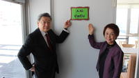 3月23日月曜日、松山キャンパスの屋上階に完成したカフェスペースの完成記念式が行われ、牧山助友学長と河野保子学部長により、プレートの設置が行われました。