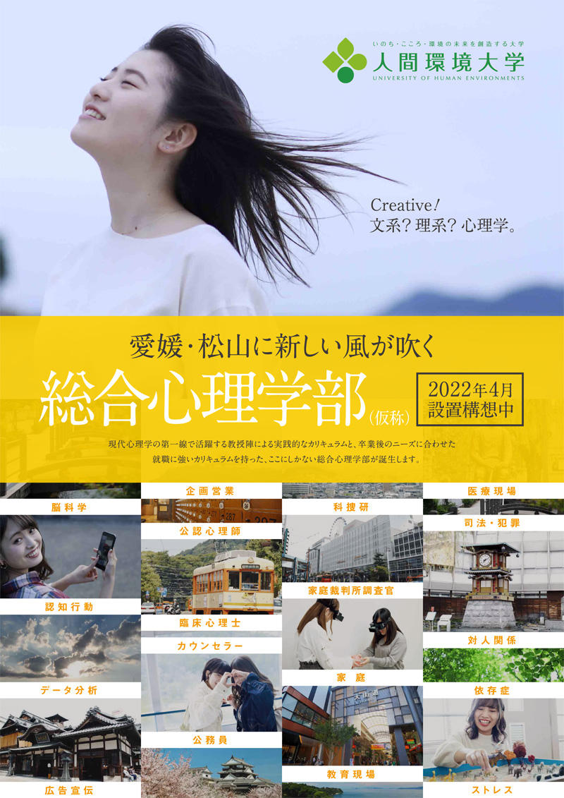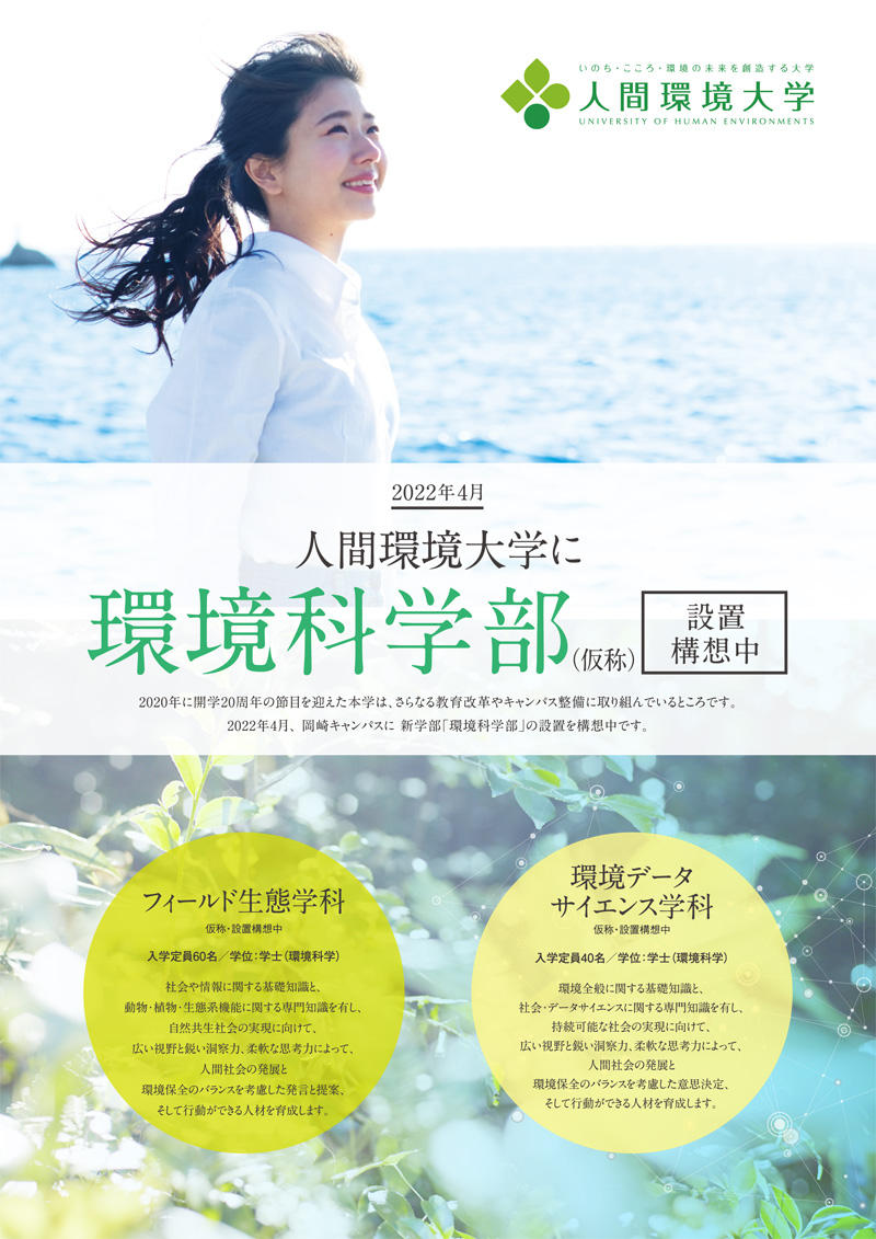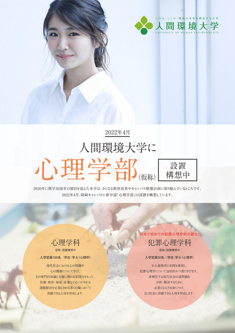 人間環境大学は、2022年4月「心理学部」「環境科学部」「総合心理学部」(仮称)の設置を構想しています。