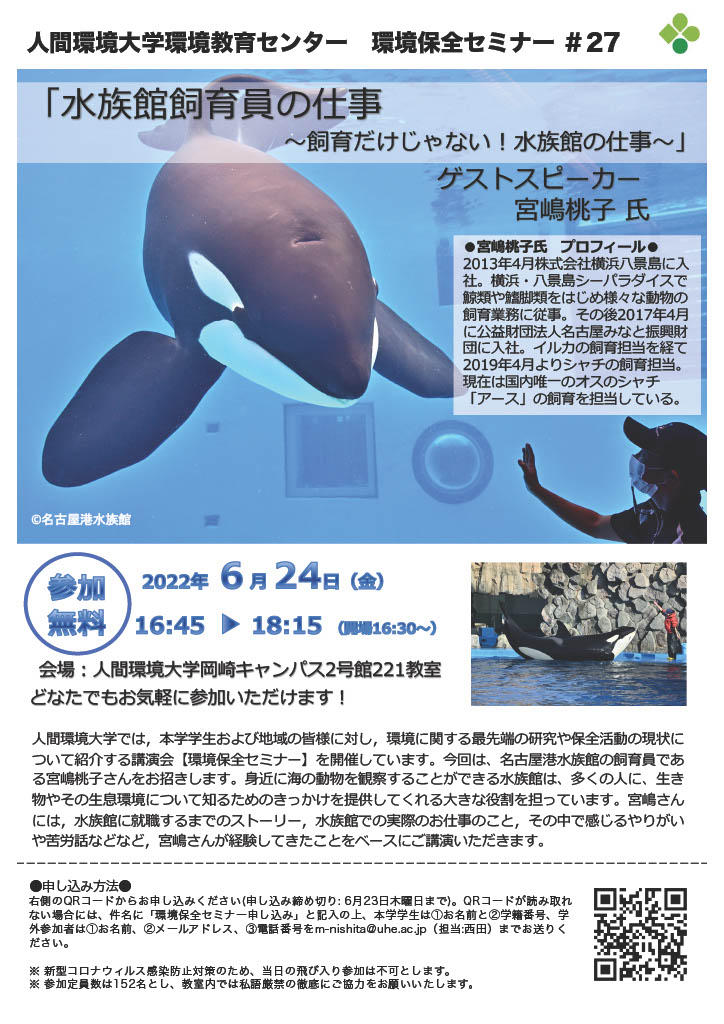 講師の宮嶋さんは、様々な動物の飼育を経験され、現在は名古屋港水族館でシャチの飼育担当をされています。セミナーでは、水族館での飼育業務についてだけではなく、実際にどんな仕事をされているのか、飼育員になるまでのストーリーなどをお話しいただきます。
