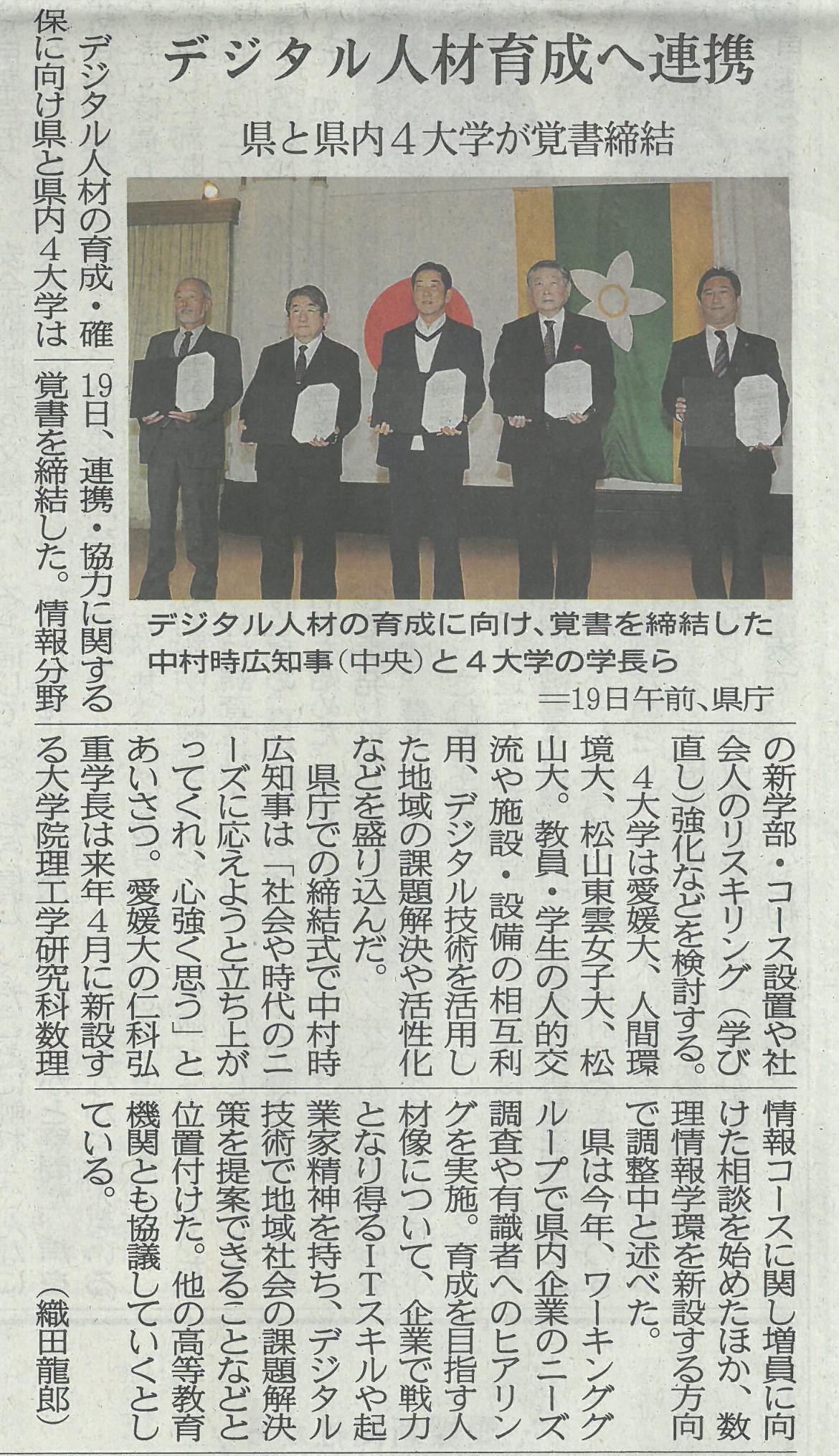 2022年12月19日、人間環境大学は愛媛県と県内4大学(愛媛大学、人間環境大学、松山東雲女子大学、松山大学)とのデジタル人材育成・確保へ向けた連携・協定に関する覚書を締結しました。
