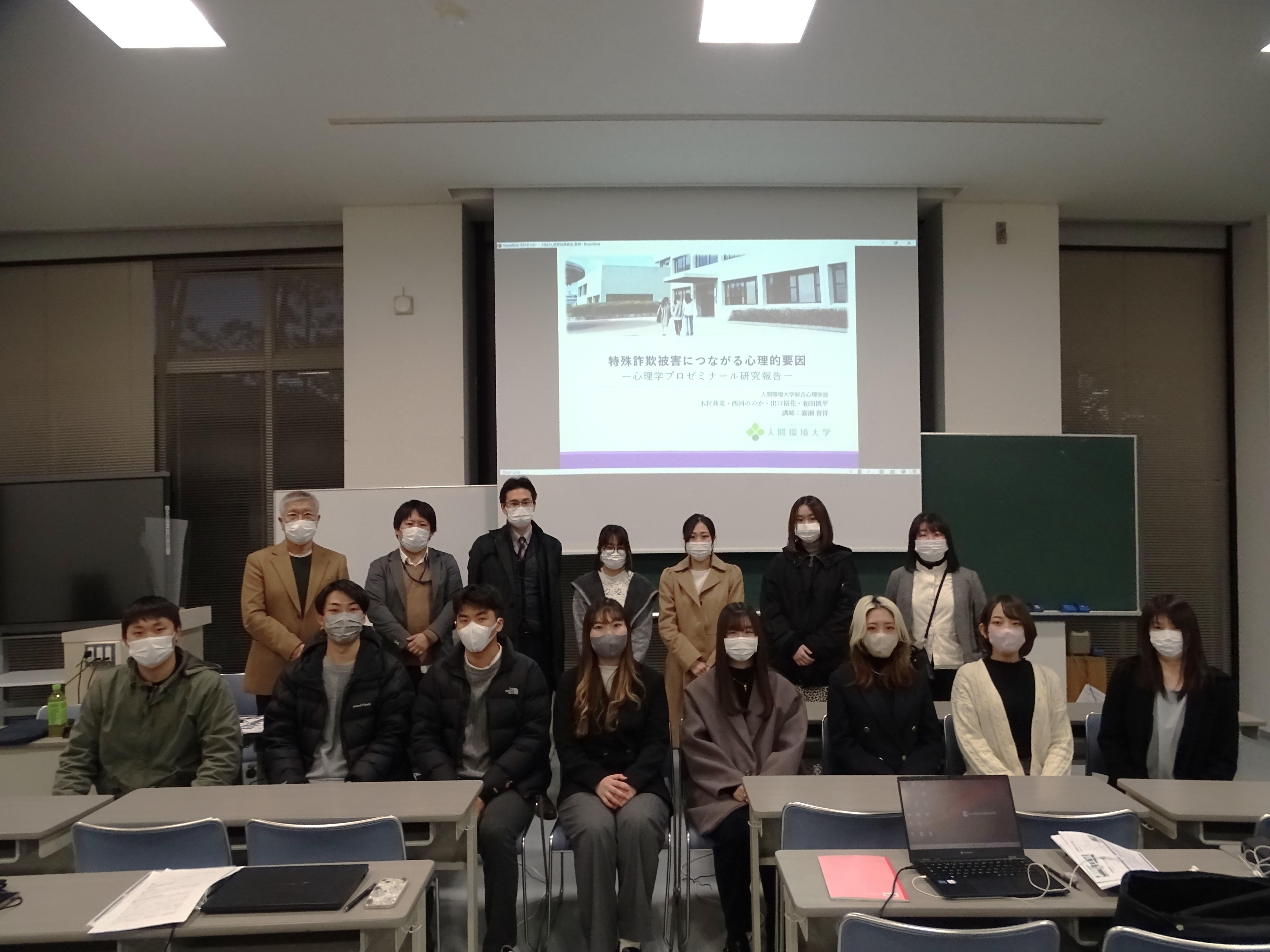 令和5年2月21日(火)に、人間環境大学岡崎キャンパスにおいて、特殊詐欺に関わる心理をテーマとした総合心理学部「心理学プロゼミナール」の活動の一環として、特別防犯対策監として特殊詐欺への対策に関わっておられる杉良太郎氏へ研究成果の報告会が行われました。