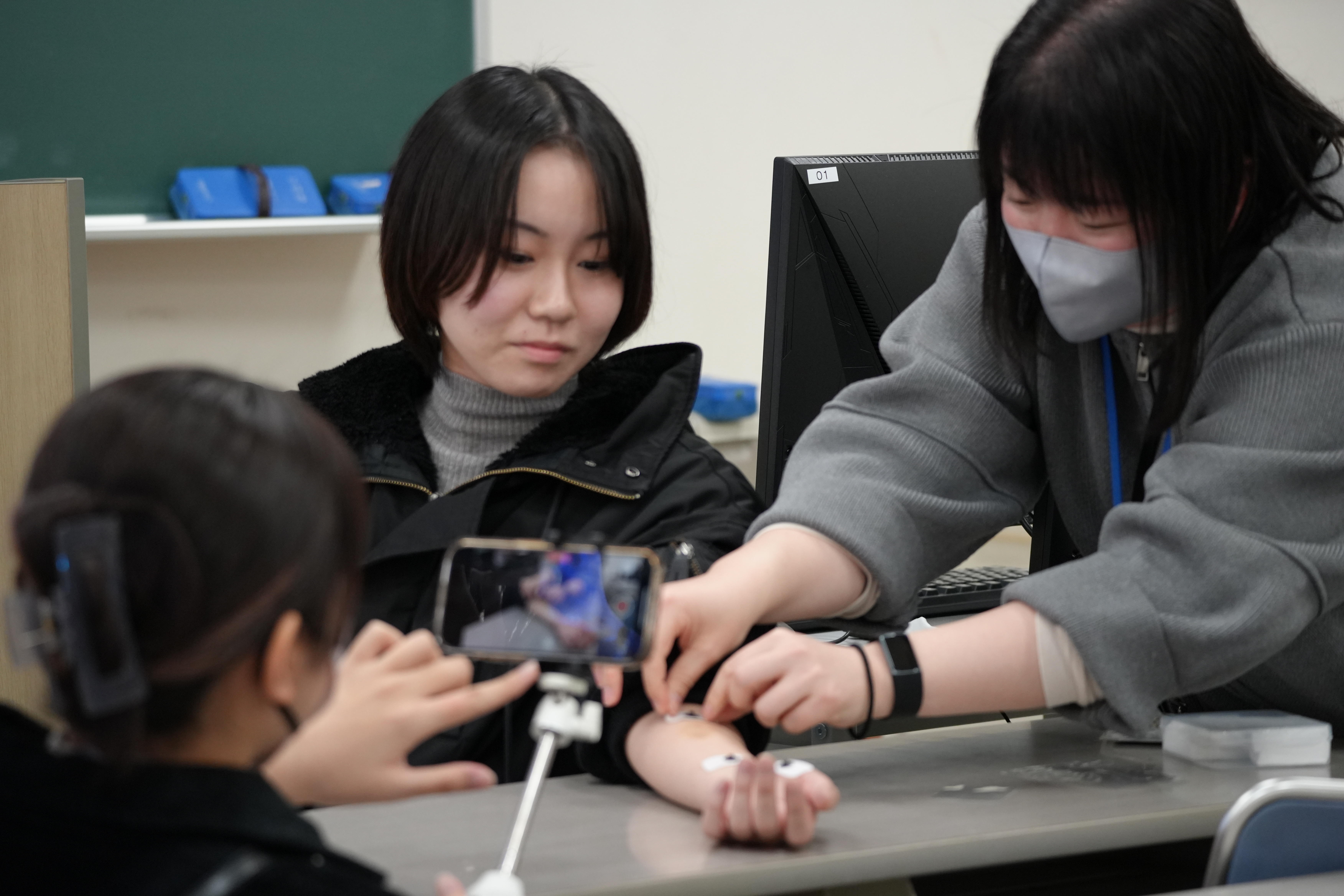 取材当日は講義形式での説明の後、ポリグラフ検査※の指標の1つである精神性発汗(緊張した時などにかく汗)について、実際に装置を用いて計測するデモンストレーションが行われ、犯罪捜査でも使われる手法について、実践的な授業が行われました。
