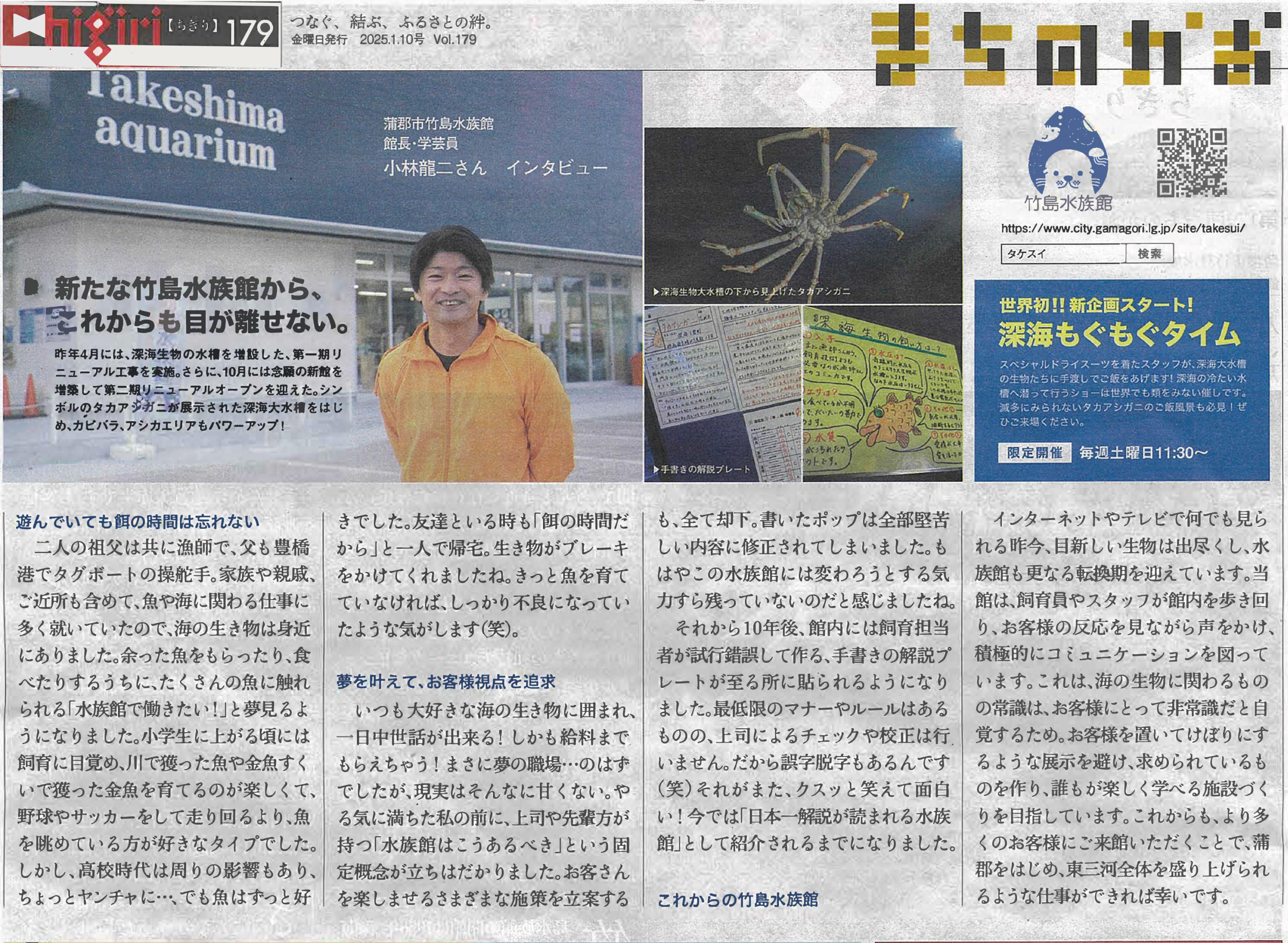 愛知県豊橋市、豊川市を中心に発行されている地域新聞「Chigiri」の2025年1月10日号 Vol.179に、蒲郡市竹島水族館の館長で、本学の客員教授でもある小林龍二館長のインタビュー記事が掲載されました。