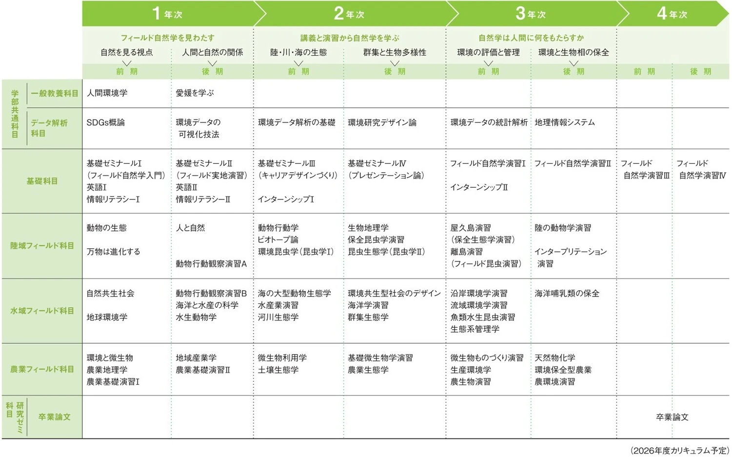 農業や水産業が盛んな愛媛県内はもちろん屋久島(鹿児島)などをはじめ全国各地の、農地、森林、河川、海洋などをフィールドに、多様な実習・演習を通して、実践的な野外調査の知識や技能を体系的に身につけます。