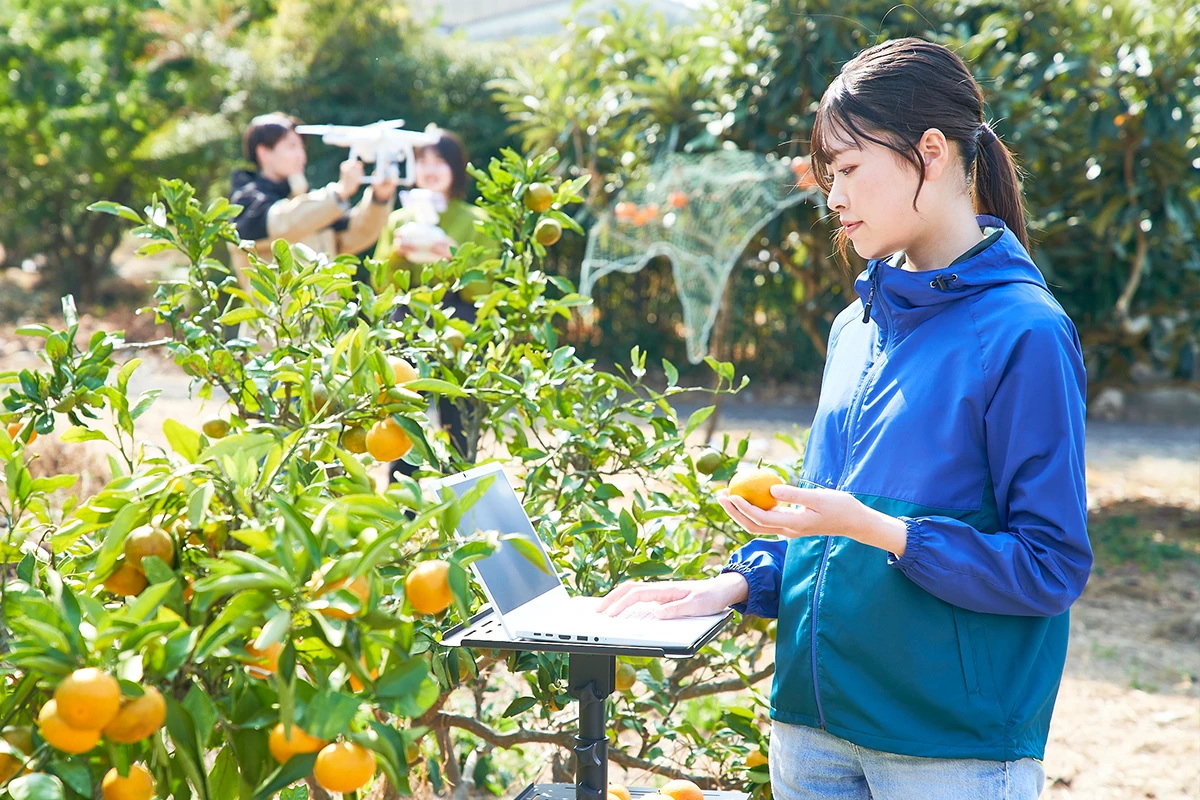 - スマート農業の演習を通じて、最新の農業技術を学びます。具体的には、IoTセンサーを用いた土壌水分量の計測、果実の大きさ推定のための光学マーカーを活用した画像取得、ドローンによる圃場計測や樹の植生診断を実践。さらに、画像処理技術を活用し、作物の成長状態をリアルタイムで監視・管理し、効率的で持続可能な農業を目指します。