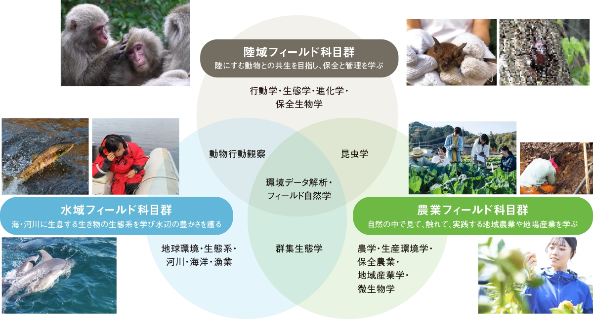 陸域及び海や川の多様な野生生物について広く学ぶことができます。また、微生物の利用や農業、水域の物質循環など、人間の生活を支える自然環境のあり方や管理についても学べます。