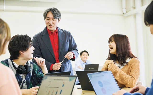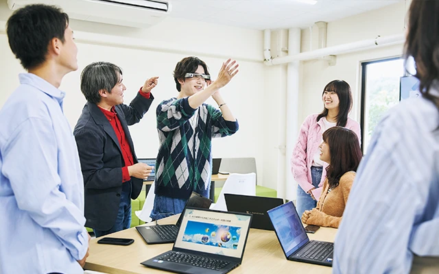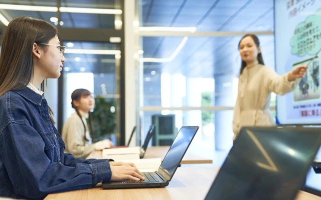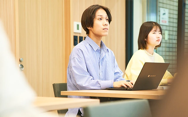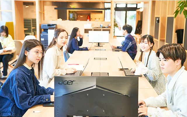 本学科では、ネットに繋がった、一人一台のいつでもどこでも使えるノートパソコンを授業中にもずっと使う環境で学習します。