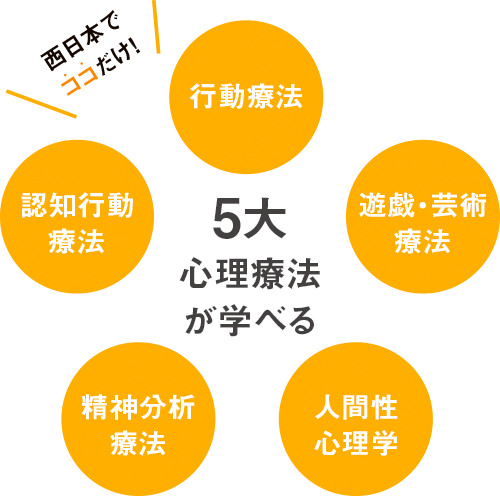 高度専門科目の中のアドバンスト臨床心理学科目には、「5大心理療法」と呼ばれる「行動療法」「認知行動療法」「遊戯・芸術療法」「精神分析療法」「人間性心理学」の専門科目を全てそろえています(西日本で唯一)。このうち、日本で唯一保険が適用される心理療法である「認知行動療法」には特に力を入れており、しっかり身につくよう、カリキュラムが工夫されています。