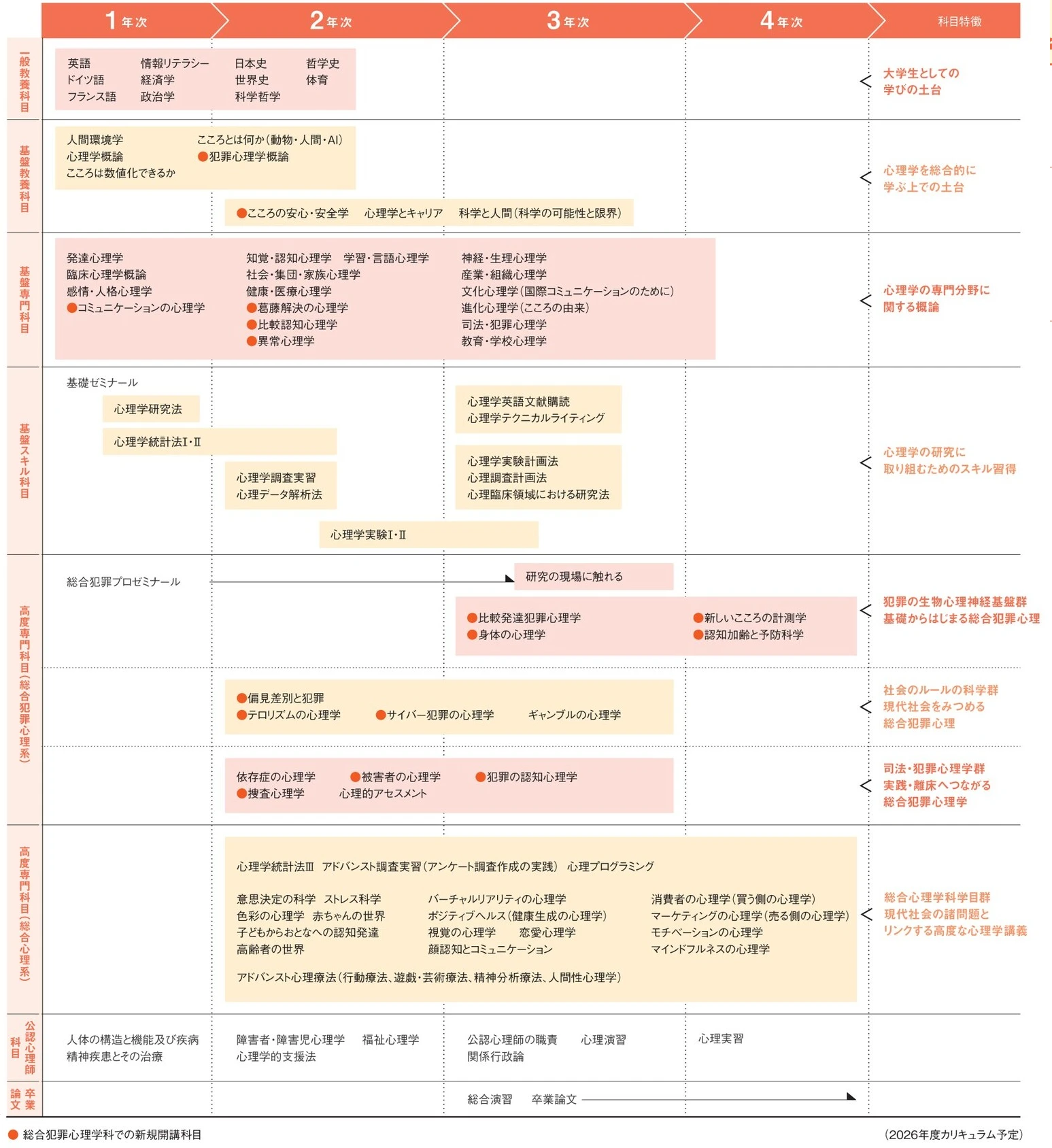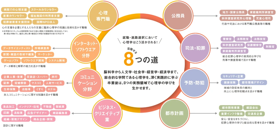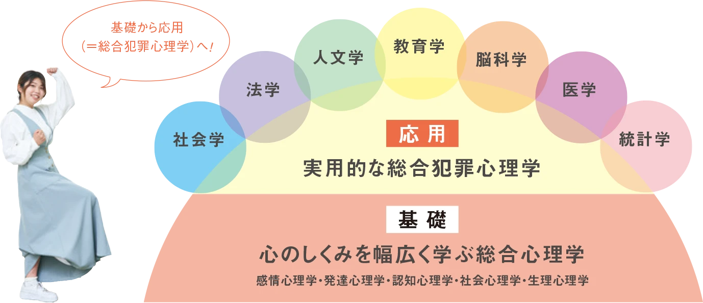 心の仕組みやはたらきを解明し、実生活の様々な場面に応用する「総合心理学科」と、あらゆる犯罪の奥に潜む心の課題の根本的な解決を図り、安心・安全な社会の実現を目指す「総合犯罪心理学科」。