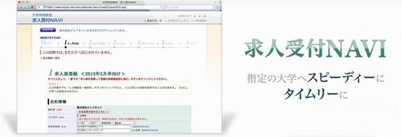 本学では、株式会社ジェイネットが提供する大学共同参加インターネットサービス『求人案内NAVI』を導入し、求人情報を学生にリアルタイムに公開しております。 つきましては求人情報を配信いただくにあたり、求人案内NAVIにてご入力をお願いいたします。